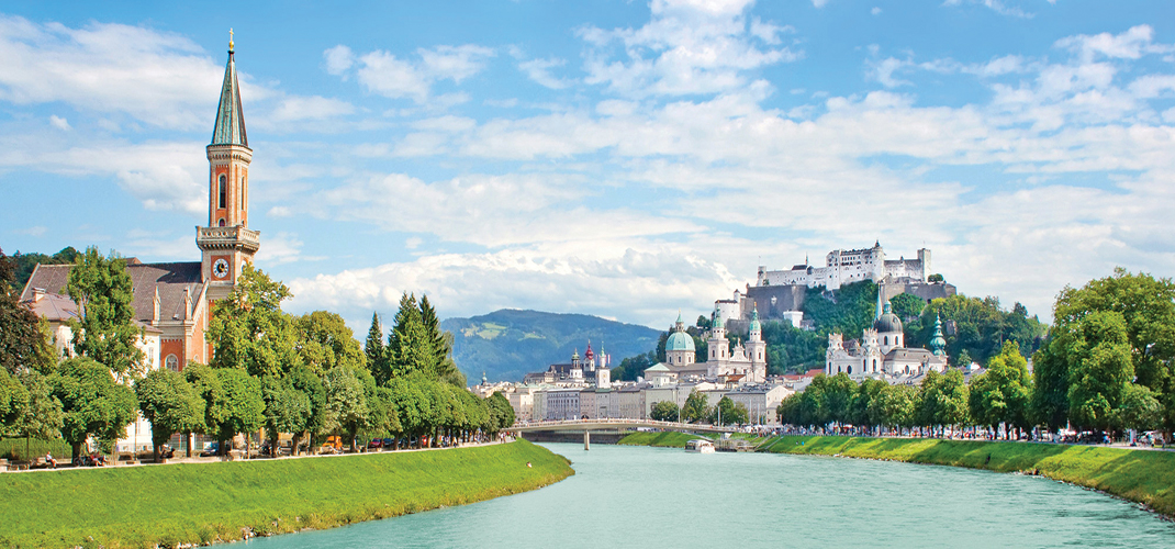 Salzburg means “Salt Castle”, referring to its massive fortress and the white gold from the mountains in the South. Situated on both sides of the Salzach River, the city is close to the foothills of the Alps and the Bavarian border. The historic UNESCO Listed “Old Town” (Altstadt) centre, with its rich mix of art and architecture hasn't changed that much since Mozart's day. The graceful domes and spires are set alongside the beautiful clifftop fortress and the surrounding mountains. This city is a unique combination of scenic Alpine landscape and architectural richness, which has led to Salzburg’s reputation as one of the world’s most beautiful cities.